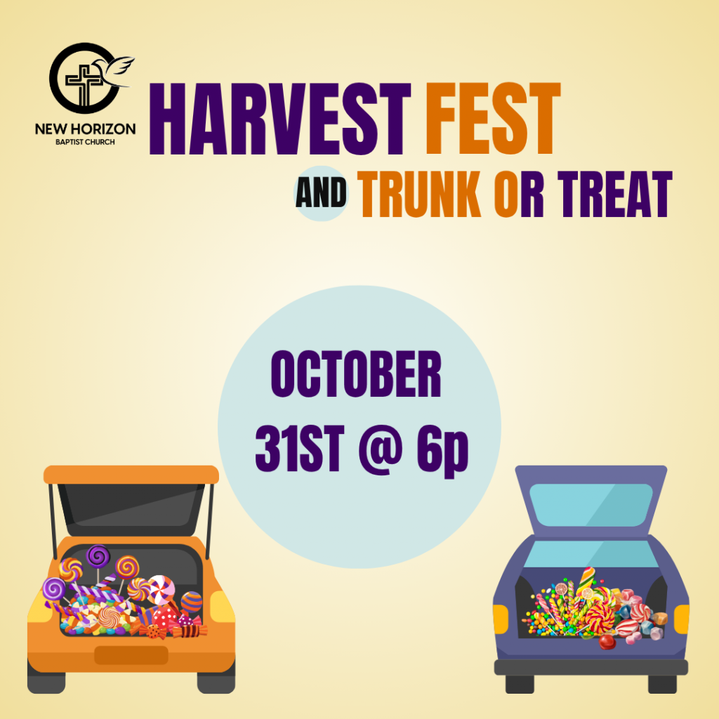 Join us for Harvest Fest on Friday, October 31 at 6 pm on the Great Lawn of New Horizon. Bring the whole family for good food, joyful games, trunk or treat fun, and more. Come laugh, play, and meet your neighbors as we celebrate the goodness of the season. Bring a friend, bring a smile, and expect memories to grow. We will save you a spot on the grass.